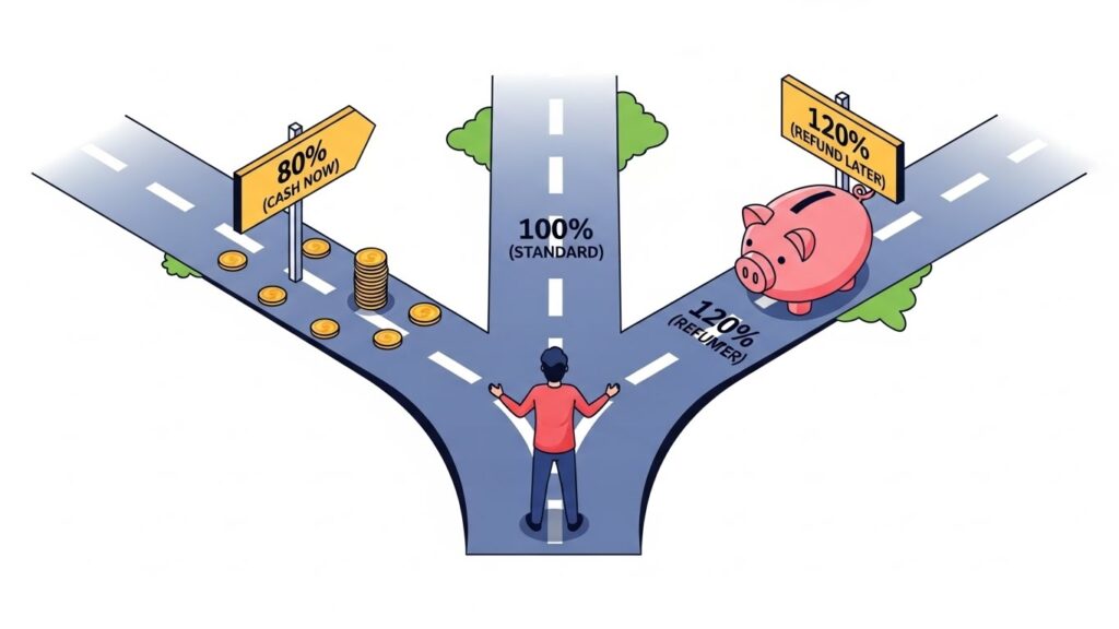 - 120% 선택자는 미리 낸 돈(144만 원)이 많아서 44만 원을 돌려받습니다.
