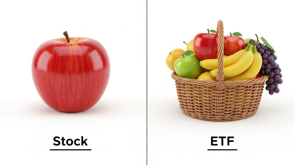 개별 주식은 ‘사과’나 ‘배’를 하나하나 고르는 것과 같아요. 맛있는 사과를 잘 고르면 대박이지만, 썩은 사과를 고르면 돈을 날리게 되죠.