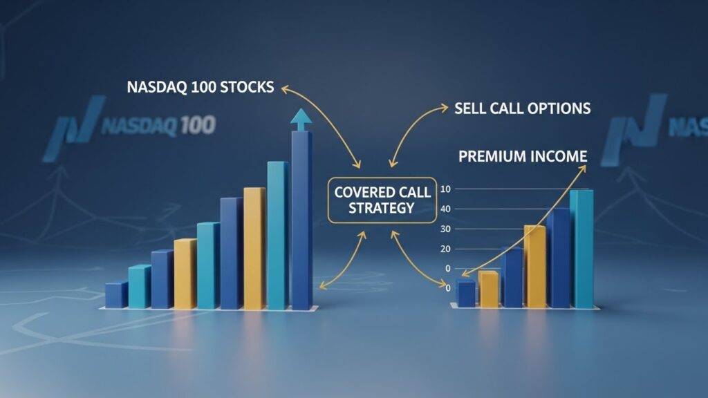 QYLD는 나스닥 100 종목을 보유하면서 동시에 콜옵션을 매도하는 ‘커버드콜’ 전략을 사용합니다.